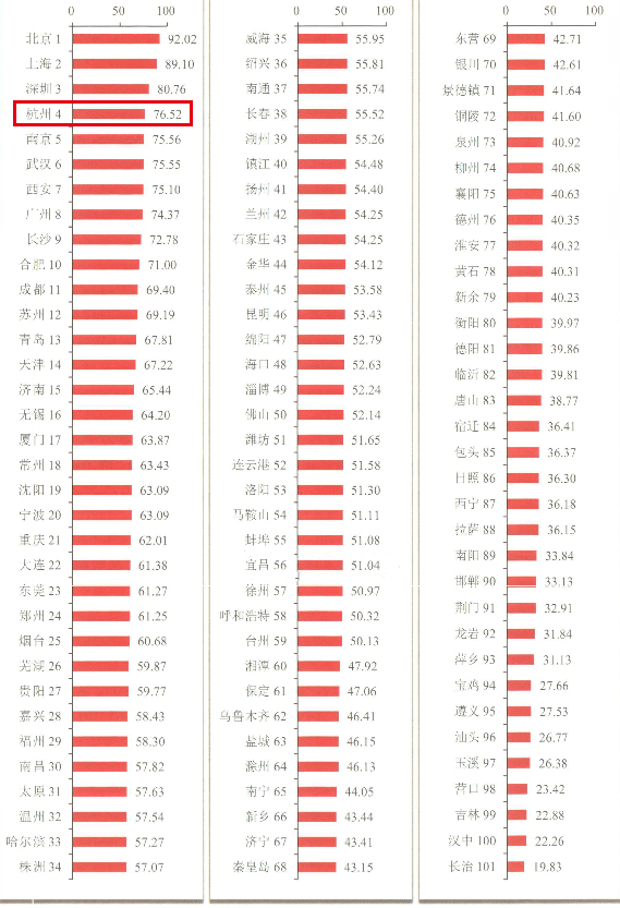 《报告》指出,杭州创新能力指数为76.52,排名第4位,属于科技强市。从具体指标看,杭州在创新生态、科技领军企业培育、国际技术输出、上市企业培育、专利产出等诸多方面优势突出。《报告》还同步发布了“全国城市创新能力百强榜”,在参评的288个城市中,杭州排名第4位。
