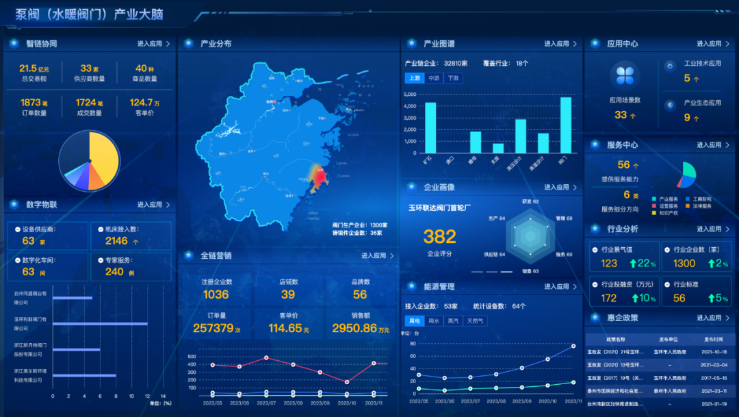 同时,基于归集的数据,产业大脑为企业运营、发展提供数据分析参考,也找到发展弱项。数据分析反馈中,玉环市注意到产业销售渠道单一的情况,因此在国内率先建立阀门全产业链电商平台,涵盖阀门产成品、生产原材料、耗材等多维度产品,并在五大电商平台上开辟“玉环水暖阀门自营专区”,店铺设计、运维、洽谈等均由平台运营公司统筹,企业无需电商团队就可“零”成本在各大平台销售产品。今年1月至10月,玉环水暖阀门产业产值达334.5亿元,同比增长5.45%。
