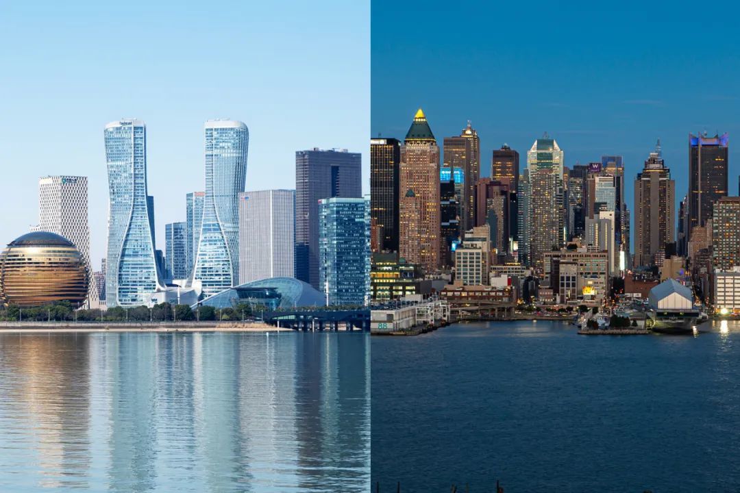 1981年,浙江省与美国新泽西州建立友好省州关系。图为浙江杭州与新泽西州威霍肯风光拼图 图源:视觉中国