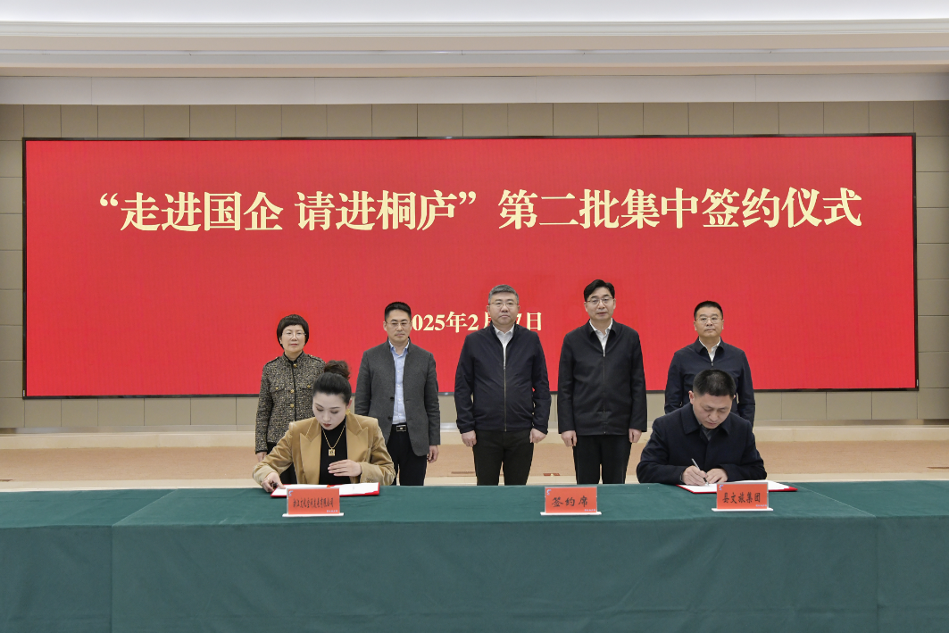 2月27日下午,“走进国企 请进桐庐”第二批集中签约仪式举行。浙江省文化产业投资集团有限公司党委书记、董事长林亮,浙江省文化产业投资集团有限公司党委委员、董事、副总经理尤匡领等省市国企领导嘉宾,县领导冯晶、邵伟斌、周萍英在台上见证签约。