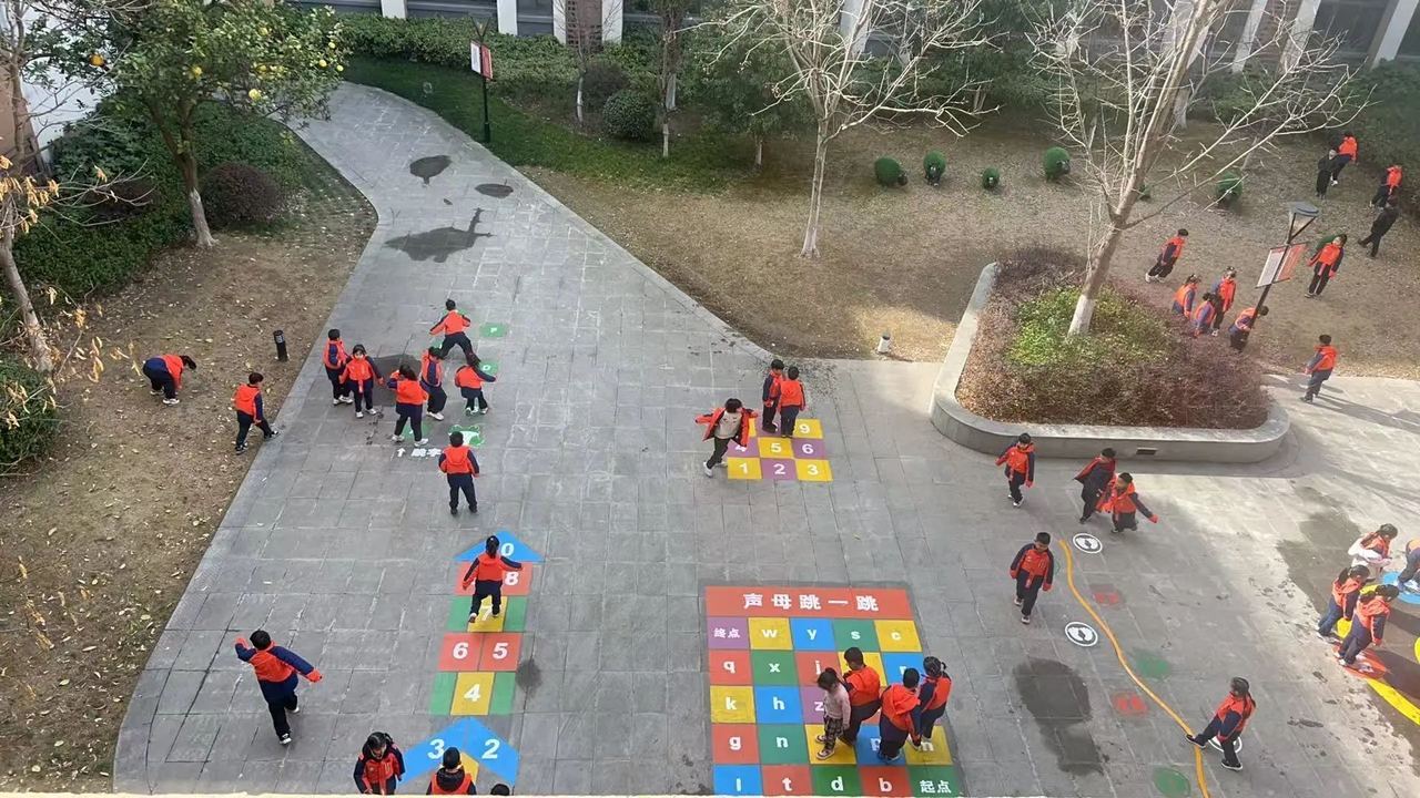 学生们在玩“跳房子”。图源 杭州钱塘区幸福河小学公众号