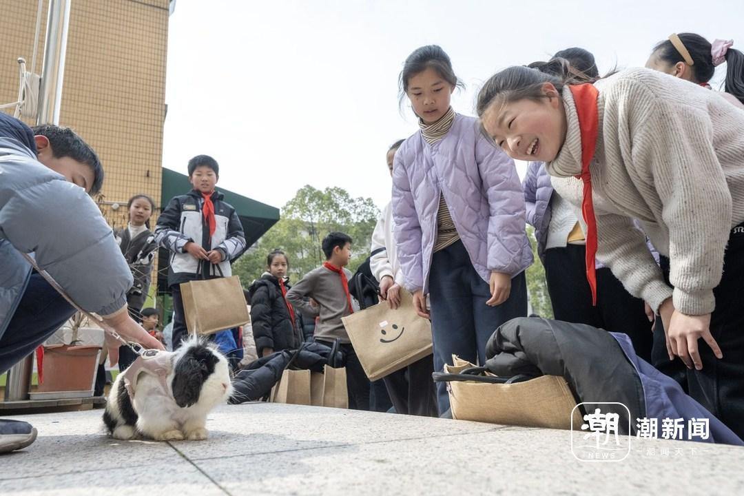 杭州市现代实验小学,学生利用课间15分钟带小兔子散步。记者 徐彦 摄