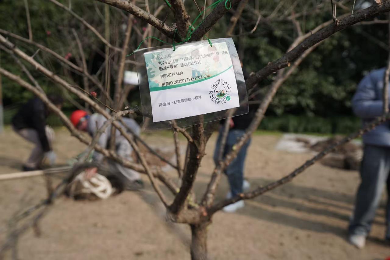 活动现场,各单位代表和树木认养企业、家庭以及众多志愿者一起挥锹铲土、扶苗填坑、提桶浇水,合力栽下梅花、鸡爪槭等树木,共同参与树木认养、抚育管护等义务植树尽责活动。此次活动依托“浙里种树”小程序线上线下联动,微信、微博、抖音、小红书等多方平台参与,实现“线下植绿、线上尽责”双线融合,推动全民通过数智融合手段共建绿色生态文明。