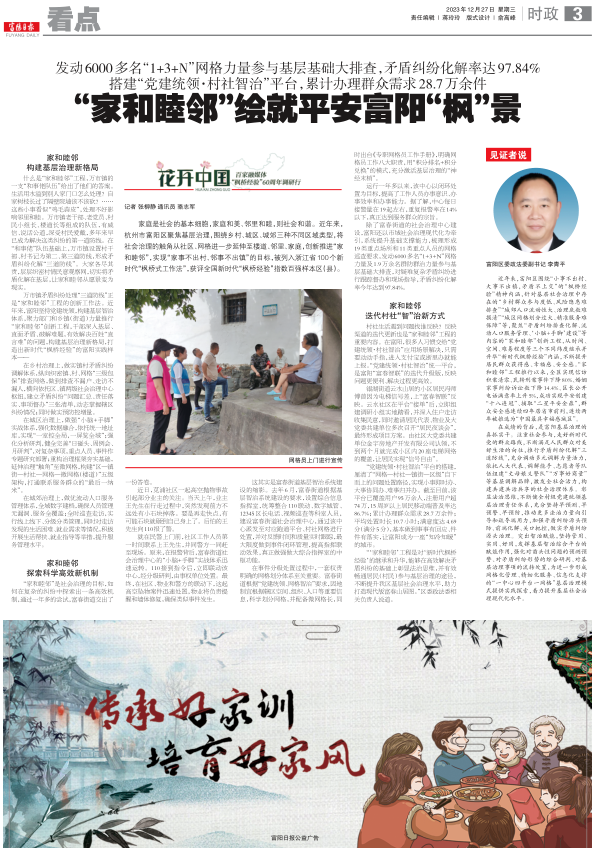 近年来,富阳深入贯彻落实党的二十大关于“提高全社会文明程度”的部署要求,开展浙江有礼、最美杭州、富春风尚打造行动,一体推进文明创建文明实践文明培育。去年,徐芝英入选“中国好人榜”,“富春风尚汇”获评省改革突破奖、省公民道德建设实践案例,春江街道新时代“小队会”入选省全域文明创建典型案例。此外,富阳深化“安全文明乘梯一件事改革”,推进智慧电梯系统扩面布点,营造安全文明乘梯新风尚。依托富春山居半程马拉松、百村篮球赛、全民运动会等体育赛事,打造“乡村版”文明赛场。紧抓“我们的节日”等载体,开展“文明婚俗”等倡导活动800余场。组建在富高校牵头的大中小学思政全学段共同体,提升思政课质量,擦亮“富春红心”思政教育品牌。召开全民国防教育工作推进会,制定工作体系和工作清单,创新打造“1+1+35”全民国防教育阵地网络,推动新时代全民国防教育走深走实。