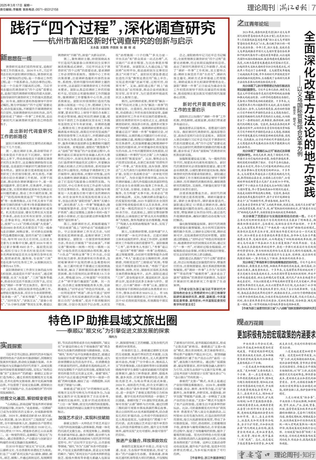 富阳是理论的“富矿”。 习近平总书记在浙江工作期间,四次到富阳考察调研,对文化传承利用、粮食安全及调查研究、富春江流域环境保护、革命文化传承等4项工作作出重要指示;党的十八大后,对富阳区“8小时外考官德”作出重要批示;在中央有关重要会议上,对全国乡村振兴作出要打造各具特色的现代版富春山居图的重要指示。对这一系列的重要指示批示,富阳区作了认真梳理,将其概括为“4+1+1”重要指示批示精神,并建立理论研究“属地+高校+社科”联动机制,推动调查研究、科技创新、粮食安全、泗洲造纸等课题研究,其中多项成果在省级理论平台刊发,比如今年3月17日,《浙江日报》理论版刊发富阳《践行“四个过程”,深化调查研究》重磅理论文章,在理论社科界进一步擦亮了富阳辨识度。