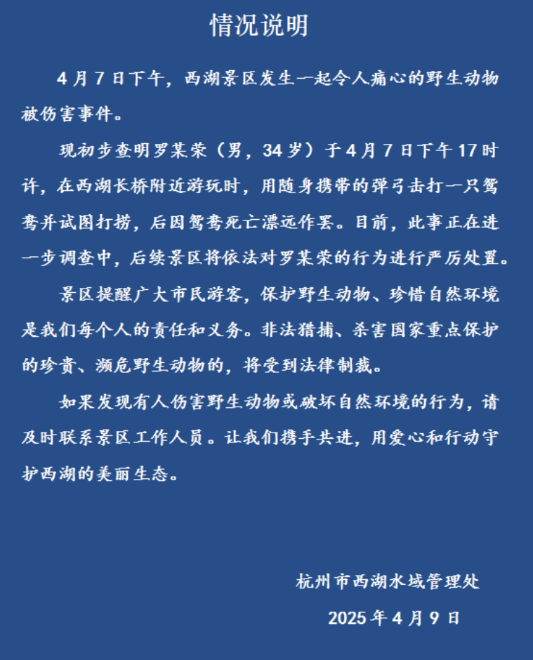 4月7日,西湖景区一只鸳鸯被弹弓打死引发关注。刚刚,杭州西湖水域管理处发布情况说明: