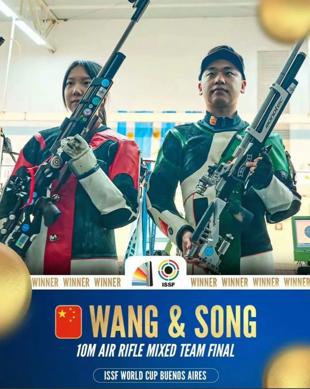 2025年国际射联射击世界杯再传捷报!继之前夺得女子10米气步枪金牌后,杭州姑娘王子菲和宋布寒搭档,以大比分17比9兑现金牌点,再次获得10米气步枪混合团体金牌,加冕双冠王!
