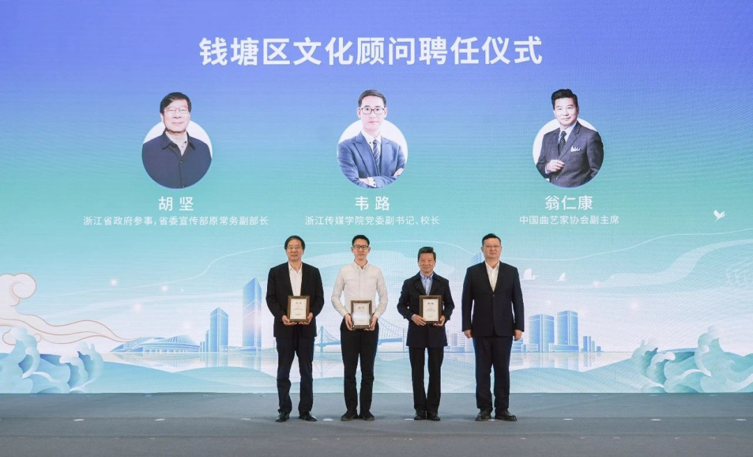 大会现场,韦路与浙江省人民政府参事、省委宣传部原常务副部长胡坚,中国曲艺家协会副主席翁仁康共同受聘为钱塘区文化顾问。