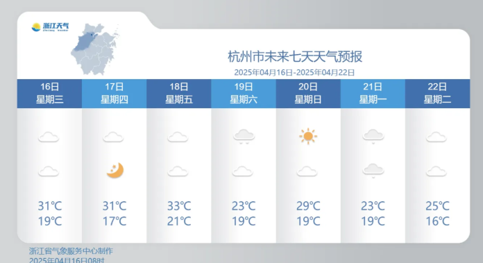 昨天(4月16日),浙江省大部最高气温升至28-31℃,最热的余姚、景宁,已经达到了31.1℃。省会杭州将最高气温提升了1.3℃,来到28.8℃。
