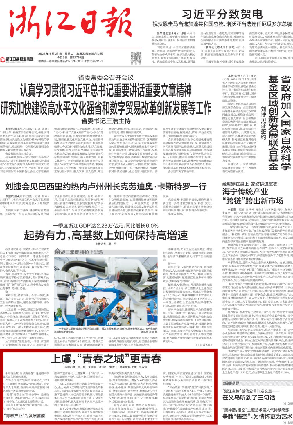 今年是上虞“青春之城”建设的第三年,如今“青春”成色如何?浙江日报对此进行头版报道。