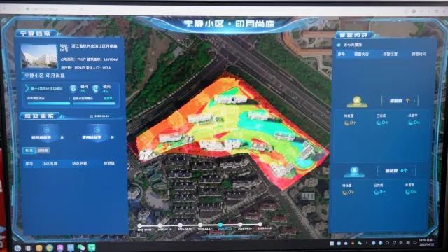 在“噪音监测后台”画面中,印月尚庭小区被一圈红色包围,但小区内部呈现黄绿色。这说明,小区内部噪音已被有效控制,但还有因临近高架的车流噪源。为了减少外部噪音的影响,小区在临近高架桥的住宅一侧“织密”了绿化带;而小区内部的噪音,则是通过“测噪”“溯噪”和“治噪”实现常态化监管,得到有效控制。