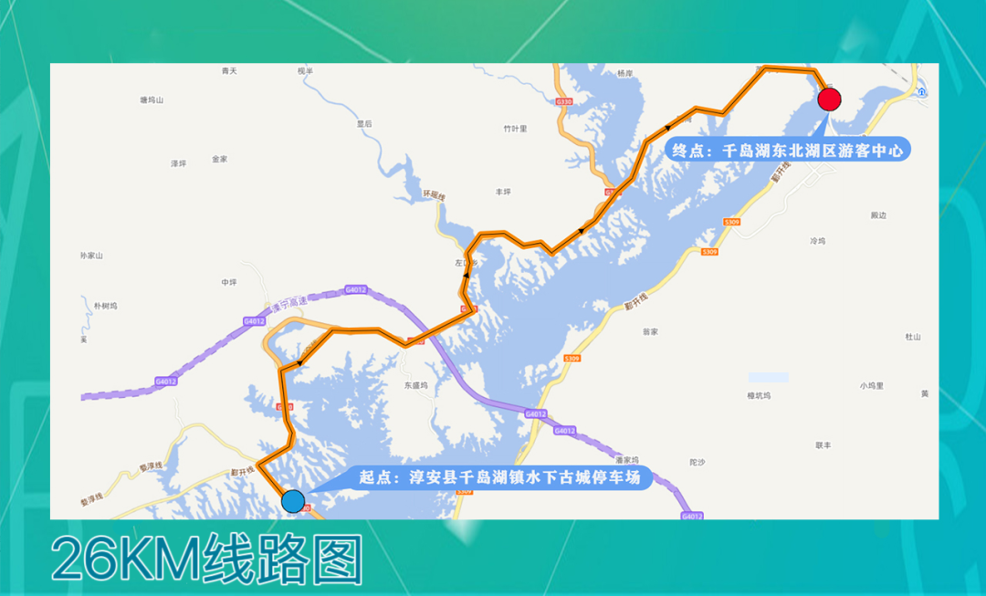 千岛湖大桥头水下古城停车场(起点)→理想花园、隧道艺术馆→“此生必骑”骑行桥→丰茂大桥→猫湾隧道→东北湖游客中心(终点)→坐大巴返回水下古城,共计26公里。(沿途设有左口乡乡政府、东北湖游客中心两个补给点。)