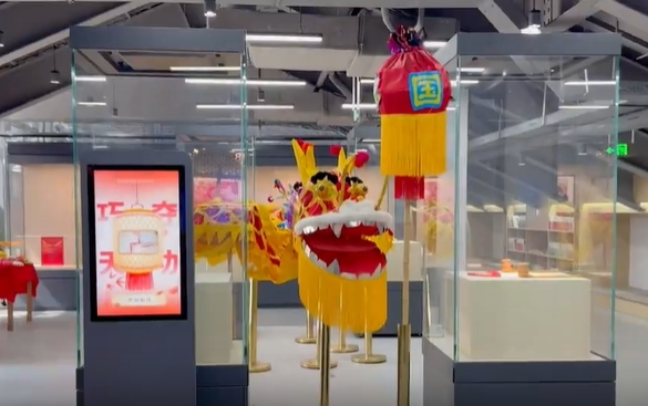 沿着楼梯走上二楼,浦沿布龙灯出现在眼前。金灿灿的龙身配上红色鳞片,让人很快联想到舞龙的热闹场景。二楼展厅分为民俗、巧匠、文学、艺术等几个板块,市民在此不仅能够欣赏到一件件非遗作品,更能直接了解到非遗背后用到的工具、材料,对非遗项目的认识也能了解得更全面、更立体。