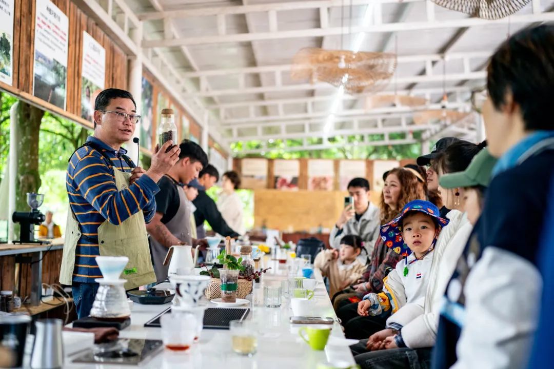 在云南省普洱市思茅区天玉咖啡庄园,游客听庄园经营者刘晓东(左一)讲解咖啡知识 图源:新华社