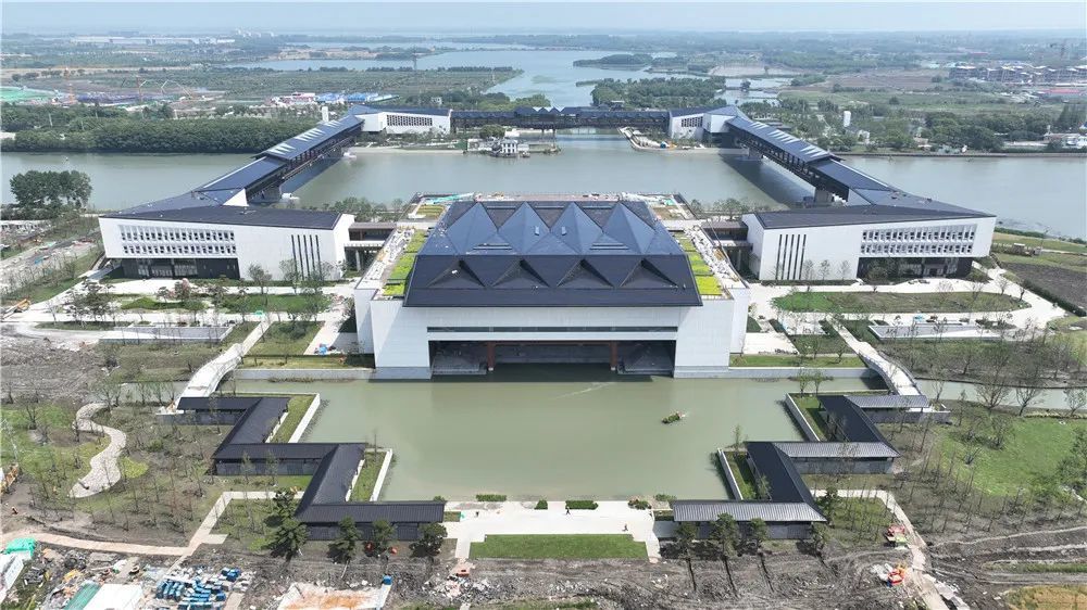 方厅水院总建筑面积约10.4万平方米,以长三角原点为中心,跨越沪苏浙三地,沿中轴线在太浦河南岸设置长三角馆,四角分别设置沪苏浙皖主题展馆,各馆通过三座跨域步行桥及连廊无缝衔接,形成跨域一体的长三角共享会客厅。
