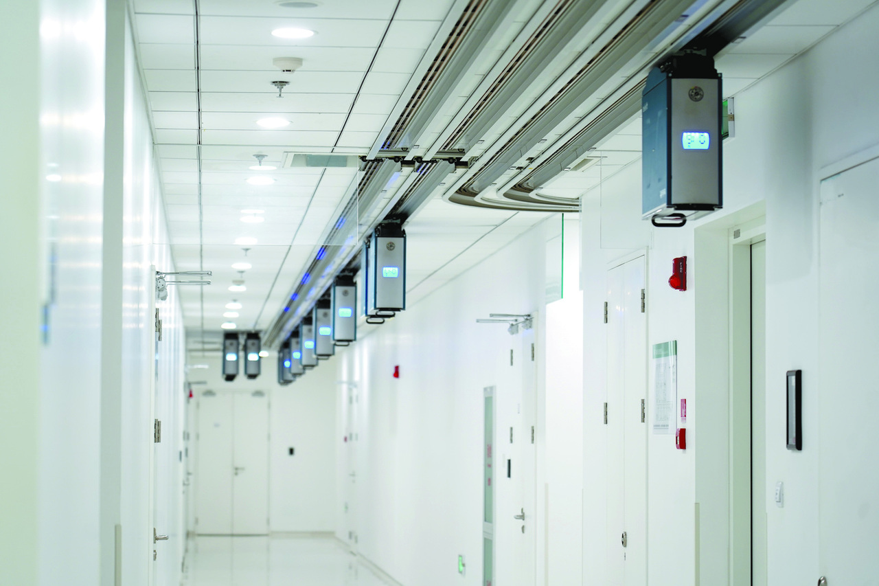 轨道小车在医院的吊顶穿行,可以运送10公斤以内的药品、耗材等。受访者供图