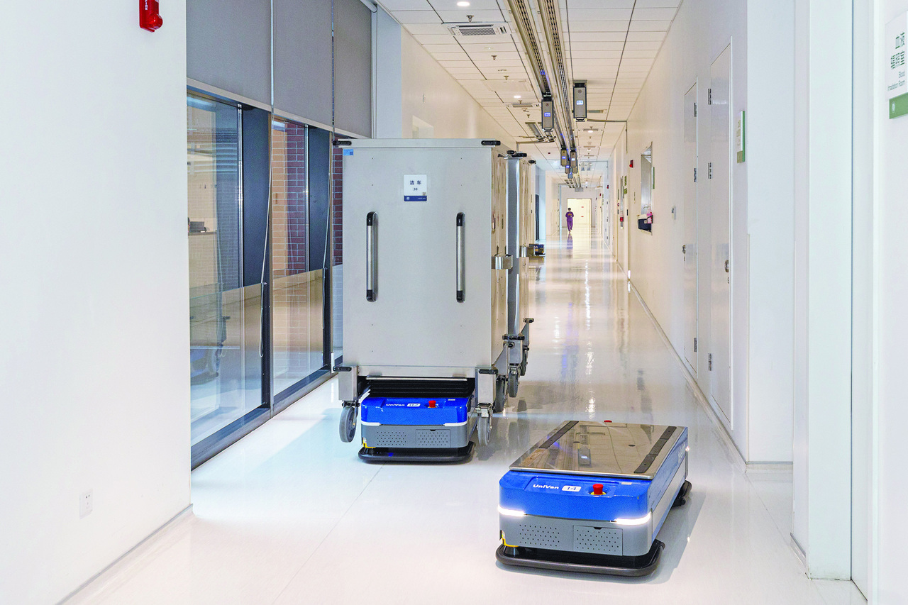 看得见的,是医院格局的重塑、就医流程的优化。在更多患者看不到的地方,多项系统也在高效运转:轨道小车在医院的吊顶穿行,长达3900米的小车物流系统,可以运送10公斤以内的药品、耗材等。此外,楼层之间还有穿梭的“小旋风”气动物流系统,以及自行上下电梯送货送餐的智能机器人AGV导航车,“三兄弟”让物流系统“飞天遁地”。