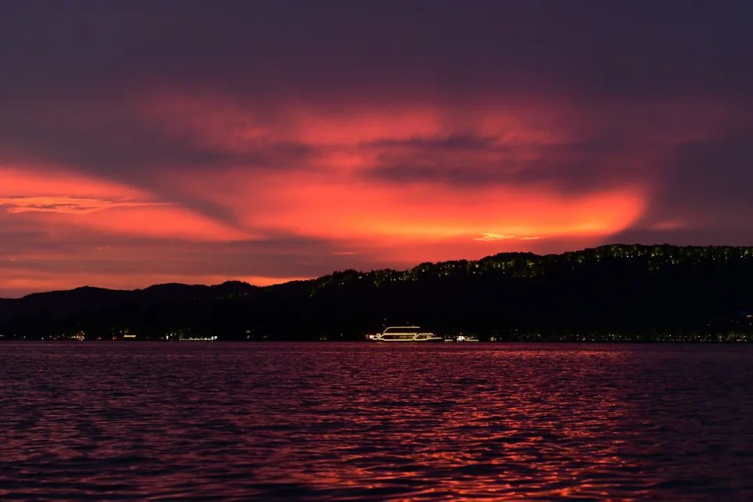 傍晚时分,出现短时强对流天气,待雨水过后西湖上空出现了一片红霞,让游客惊叹不已。