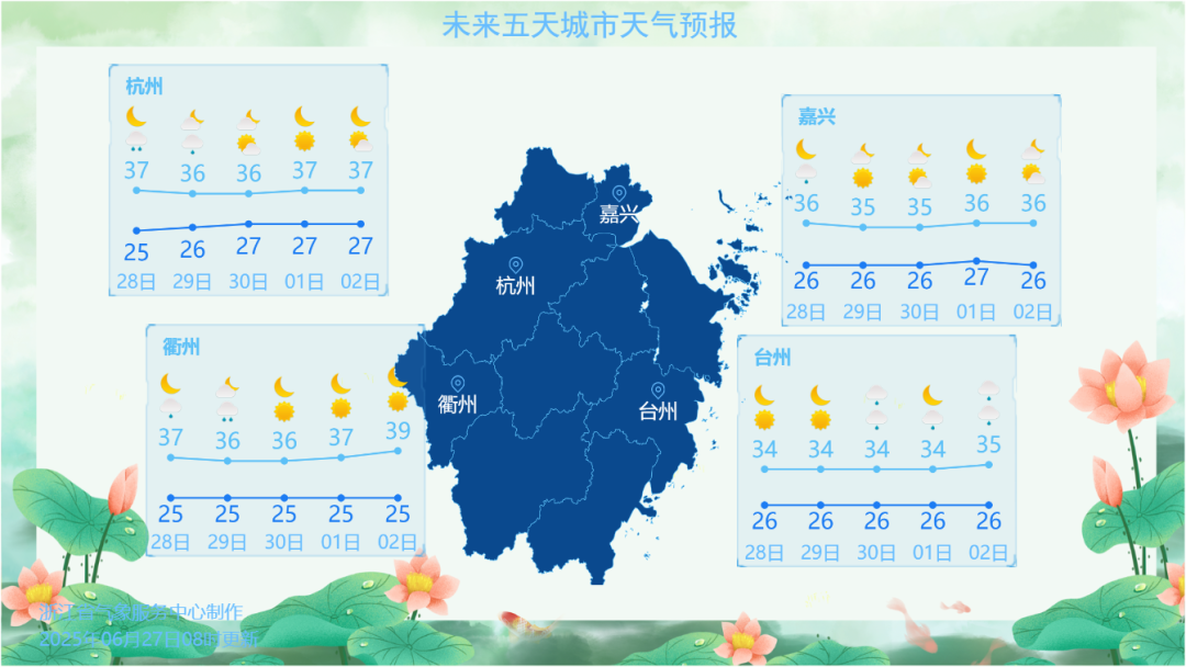 省气象台说,6月30日至7月4日,浙江主要受副热带高压加强控制,30日起以晴热高温天气为主,气温再上一个台阶,大部地区最高气温36-38℃,局部39-40℃。