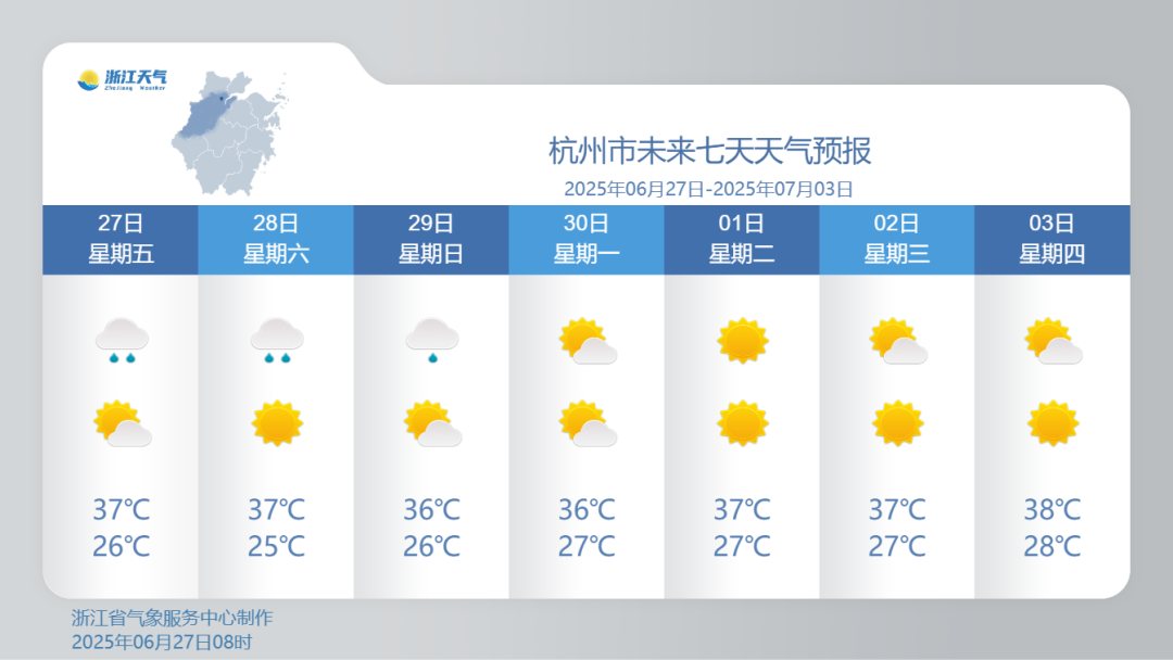 其中杭州或遭高温七连击,今明天最高气温都可达37℃。大家做好防暑降温工作,尽量避免午后气温较高时段出行,谨防中暑、热射病的发生。