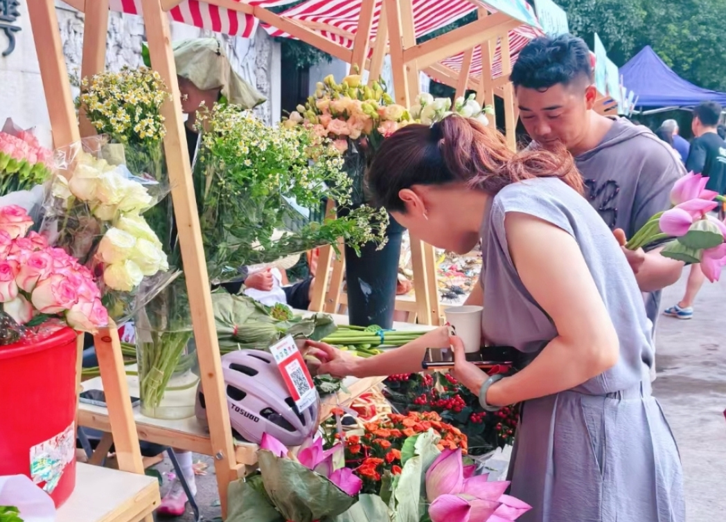 很多人不知道的是,马塍花市源于一只冰箱——2023年6月,几位商户找到西溪街道文天社区。“天热了,他们想在路边摆一只共享冰箱,放上棒冰饮料,供路人免费取用。”文天社区党委书记王烁翌说,在社区支持下,“共享冰箱”出街,效果出奇地好,不少沿街商户捐钱捐物,冰箱里的“内容”越来越多,除了冰饮,还有水果、面包、零食……这个冰箱,也成了商户和居民的“联络点”,一来二去大家熟络了,连相互之间的纠纷都少了。