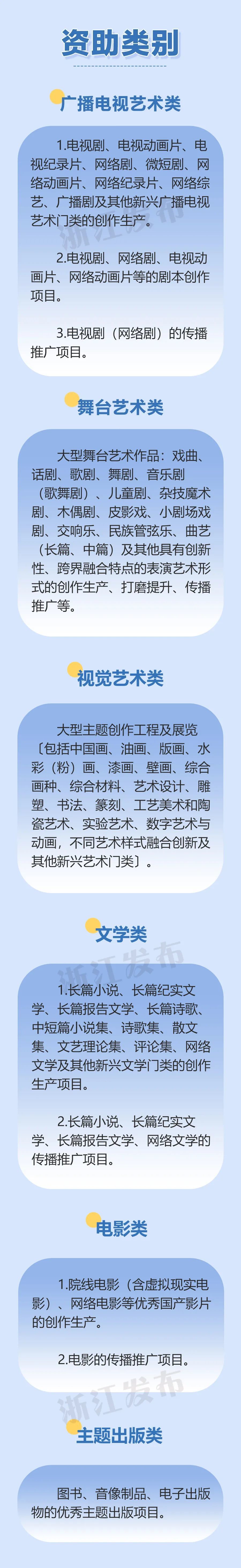 经理事会批准,2025年度浙江文化艺术发展基金项目申报工作正式启动。基金资助类别包括广播电视艺术类、舞台艺术类、视觉艺术类、文学类、电影类、主题出版类。