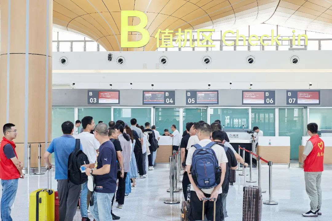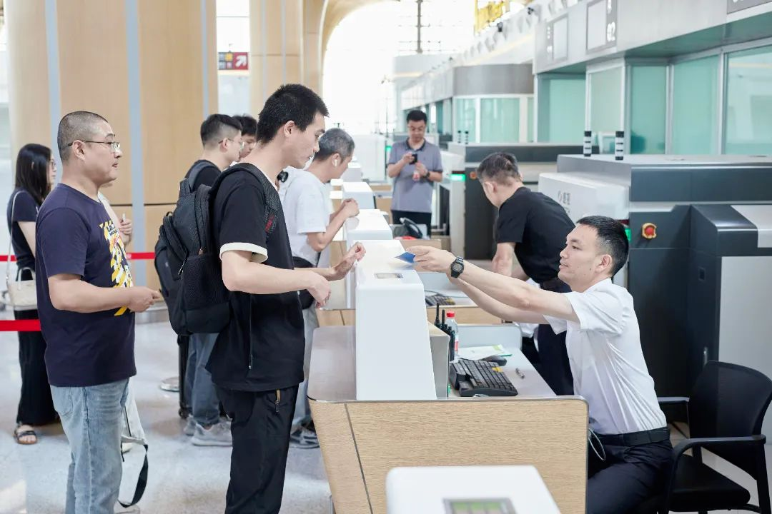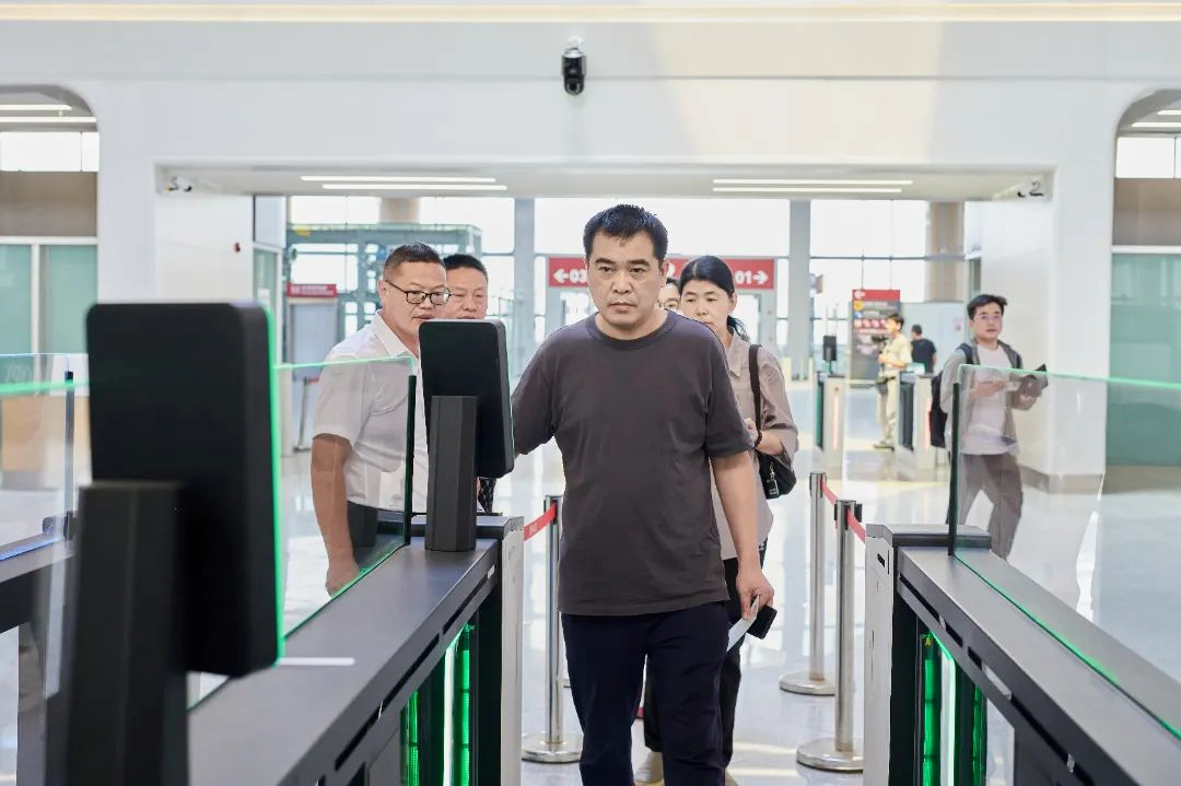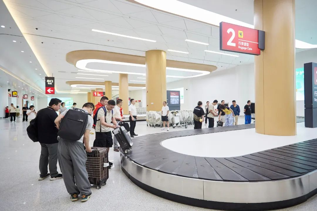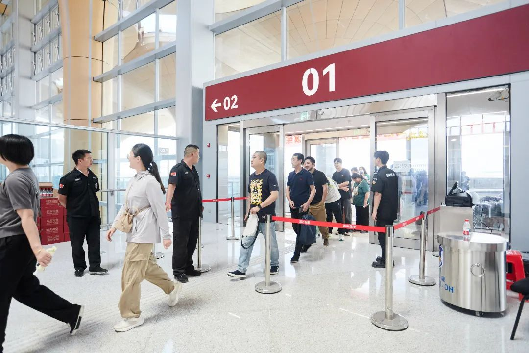 13:00,演练准时打响。“旅客”从01号门有序进入,防爆检查严阵以待。值机柜台前队伍有序移动,行李托运传送带平稳运转;安检通道内探测仪嘀嘀作响,验证、查验一丝不苟。候机区里“旅客”静待登机指令,登机口工作人员整装待发。与此同时,模拟进港航班MU1112T“呼啸落地”,接机引导员迅速就位,引导“抵达旅客”通过廊桥,行李转盘随即启动,模拟行李“如约而至”。航站楼内,广播指令清晰有力,对讲机应答此起彼伏,模拟交谈声交织回响——虽为演练,却逼真还原了机场高效运转的脉搏与心跳!