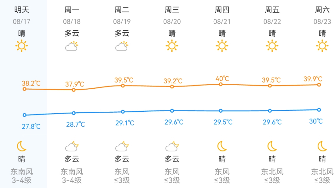 而今天,沿海地区多云,局部有时有阵雨或雷雨,其它地区晴到多云。根据省气象台高温报告,除沿海地区外大部日最高气温可达35-38℃,局地39℃以上。