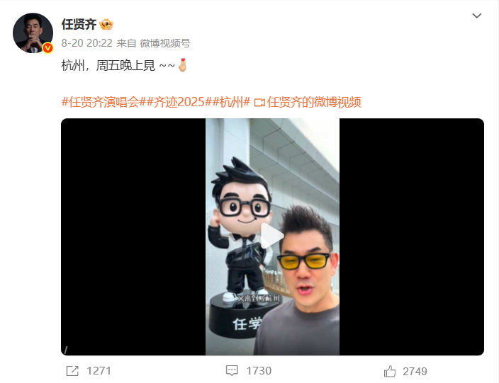 据悉,任贤齐“齐迹·2025”巡回演唱会——杭州站,将于8月22日至24日在杭州奥体中心体育馆举行。