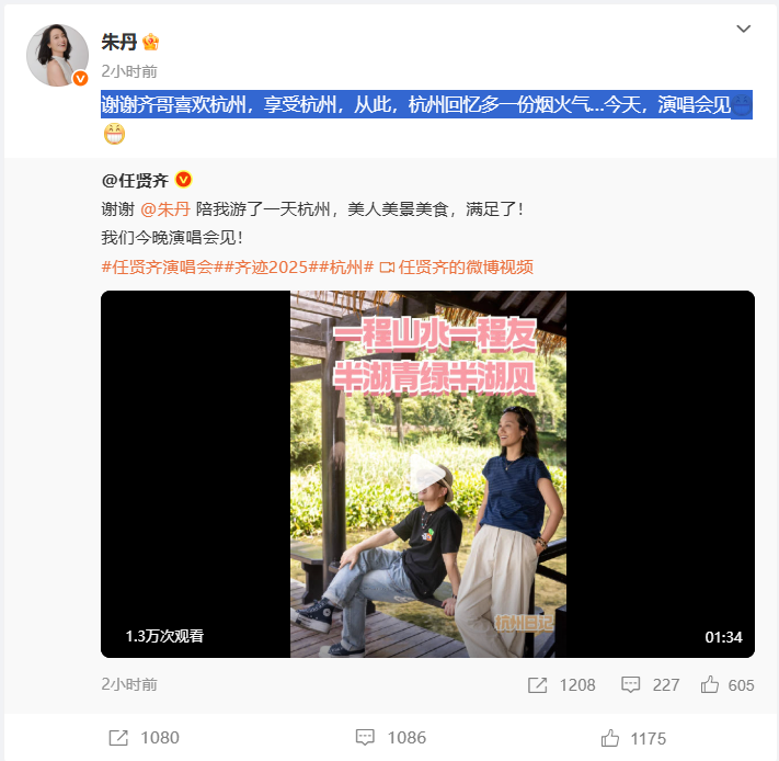 朱丹也发文回应: 谢谢齐哥喜欢杭州,享受杭州,从此,杭州回忆多一份烟火气…今天,演唱会见