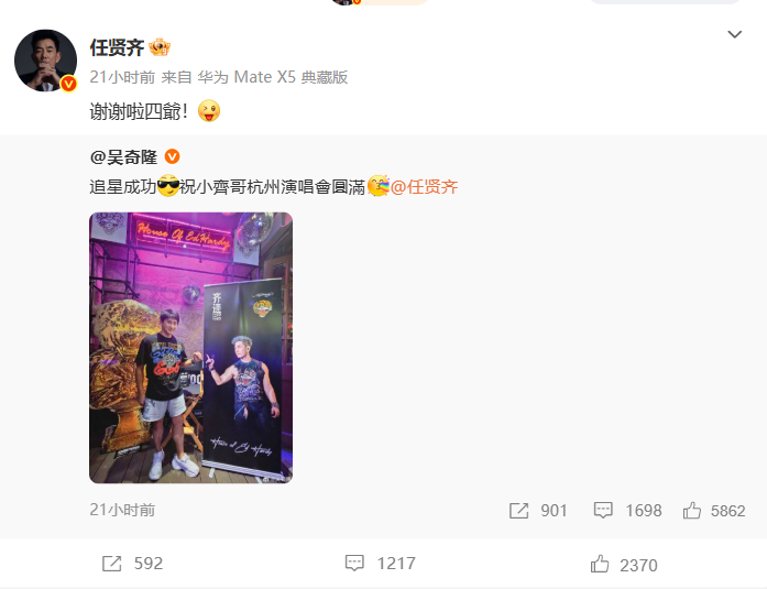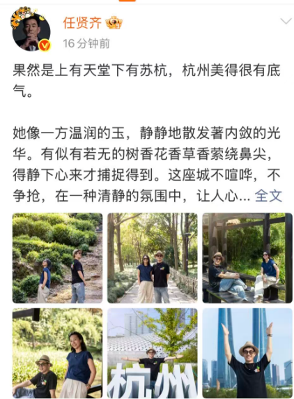 今天下午,任贤齐又连发两条微博,赞美杭州。