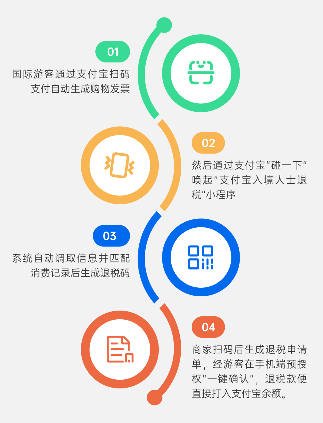 杭州坚持“智慧+便捷”理念,推出“一键退税”服务,实现旅客自助申请、商户一键开单、业务自动流转。入境游客在购买商品后,3步即可完成退税: