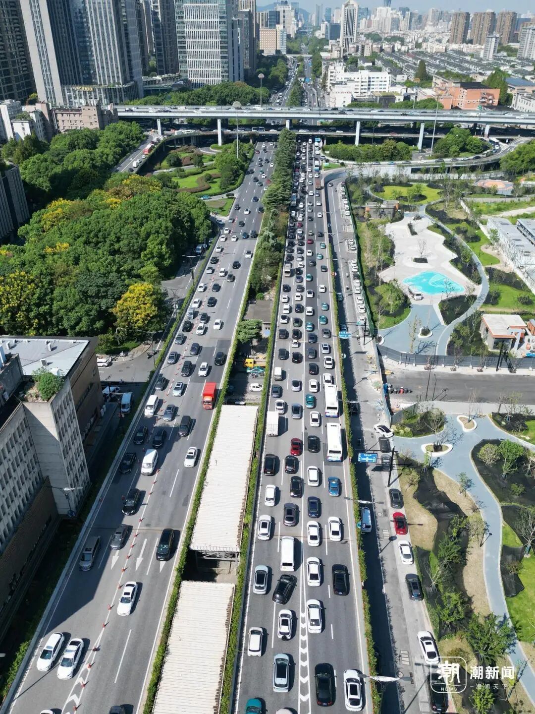 站在东门大厦边的人行天桥上,可以看见车流一路延伸至秋石高架段,整个路段处于缓行状态。