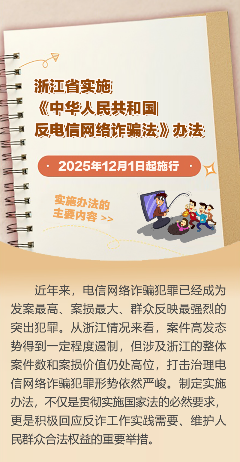9月26日,浙江省第十四届人大常委会第十九次会议审议通过了《浙江省实施<中华人民共和国反电信网络诈骗法>办法》, 将于2025年12月1日起施行。该实施办法是全国范围内第一部反诈领域的地方性法规。