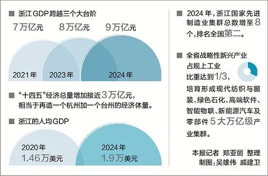 2024年底,浙江新增浙东工业母机集群、环杭州湾现代纺织服装集群等4个国家先进制造业集群,总数从4个翻番至8个,排名从全国第3升至第2,实现“倍增进位”。