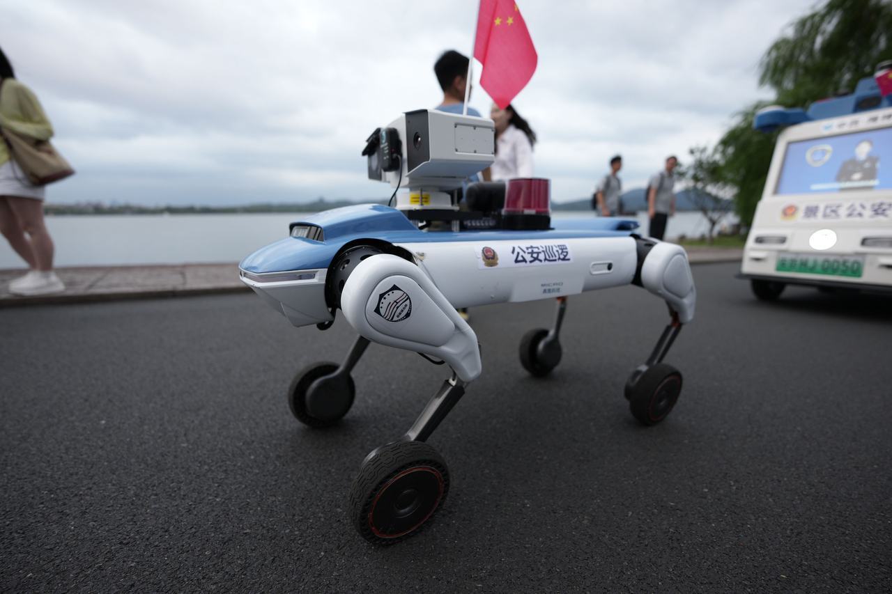 西子义警携手智能机器人“杭小西”、机器狗“杭小庙”组成的队伍正在开展“人机联巡”,让国庆期间的平安建设既有“科技感”,又有 “烟火气”。
