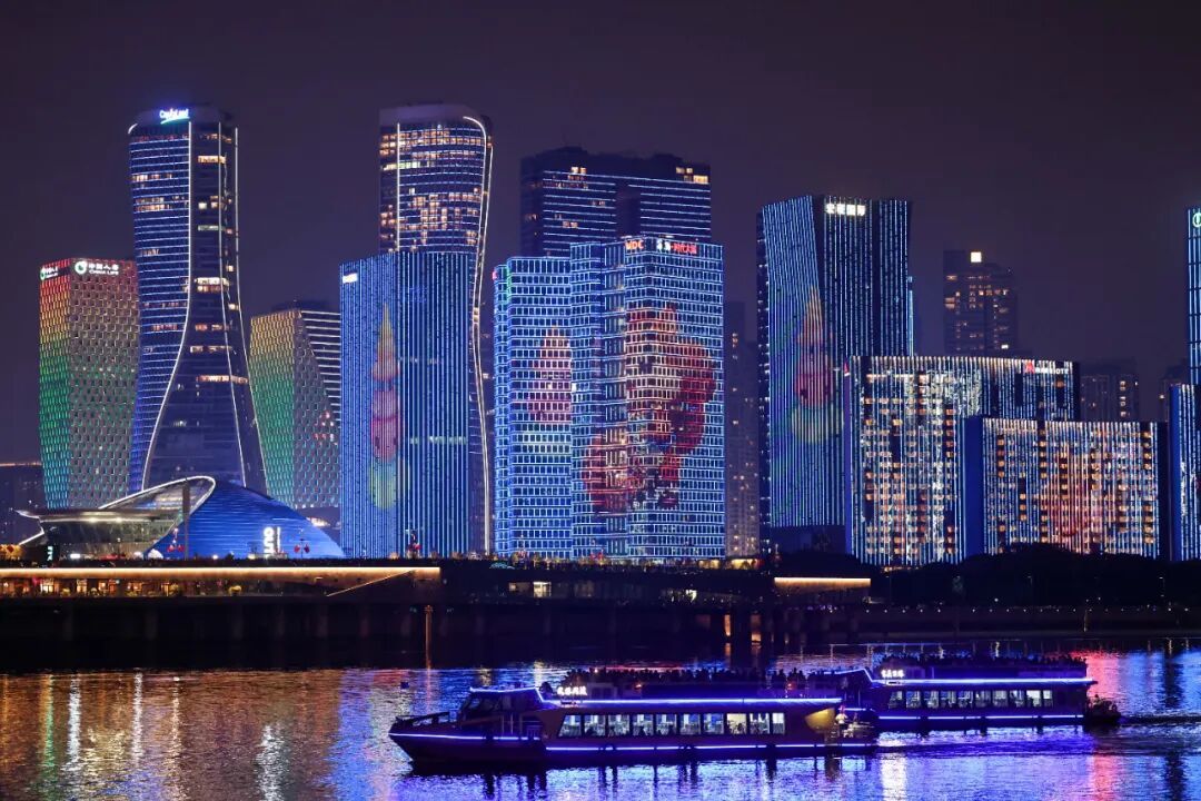 10月2日,游客乘坐游船观赏杭州钱塘江沿岸夜景 图源:新华社