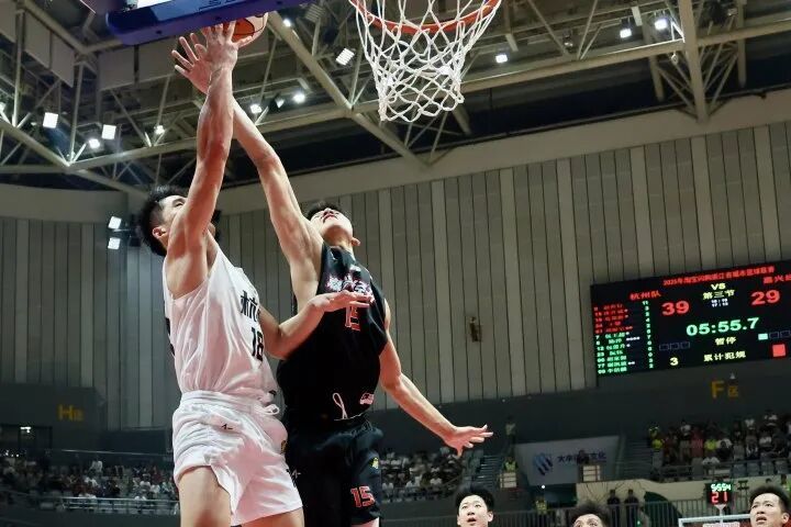 一开场,杭州队取得了8:2的领先,但随后嘉兴经开区队的头号得分手潘承恺外线火力全开,很快帮助球队把比分扳成16:16平。上半场双方打得很焦灼,但杭州队以33:29暂时领先4分。