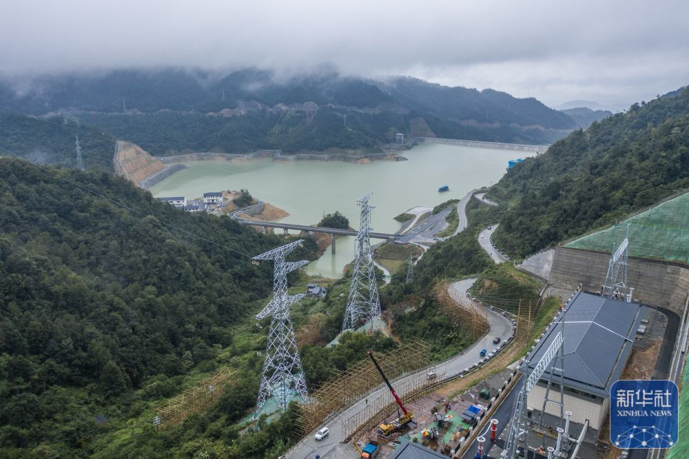 9月23日拍摄的浙江天台抽水蓄能电站的开关站(右下)、输电铁塔以及下水库。