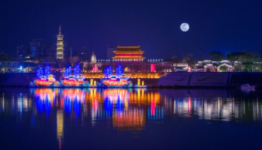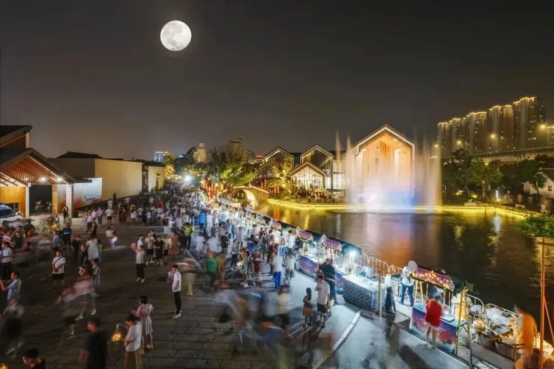 柯桥古镇各式瓦木结构的木楼、雨廊、翘檐、阁楼错落有致。日落后璀璨的霓虹装点了整个古镇,灯火辉煌,梦幻迷人。坐在河畔,一边惬意地围炉煮茶,一边欣赏天空的明亮“玉盘”。这个中秋,月圆、人团圆!