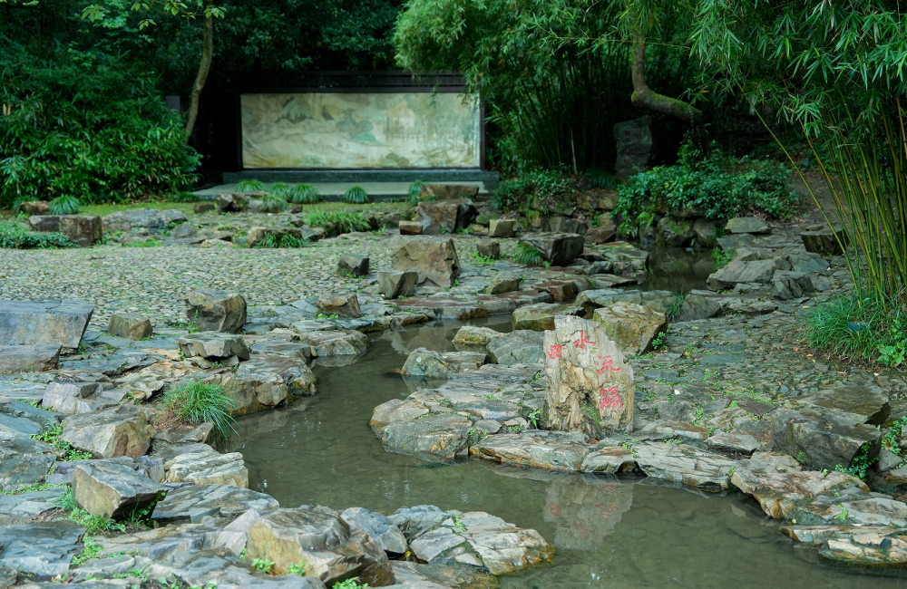 兰渚山下的兰亭,清澈溪水潺潺流淌,四周茂林修竹郁郁葱葱,曲水流觞的景致藏着千年书法雅韵,每一寸土地都浸润着文人风骨。