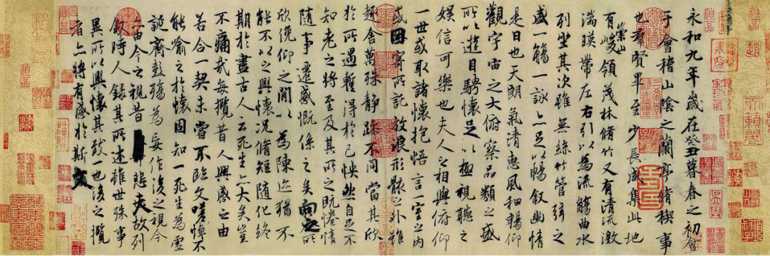 永和九年,岁在癸丑,暮春之初,会于会稽山阴之兰亭,修禊事也。群贤毕至,少长咸集。此地有崇山峻岭,茂林修竹,又有清流激湍,映带左右,引以为流觞曲水,列坐其次。虽无丝竹管弦之盛,一觞一咏,亦足以畅叙幽情。
