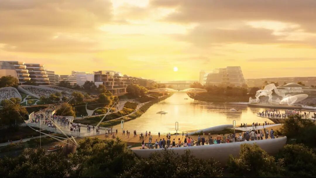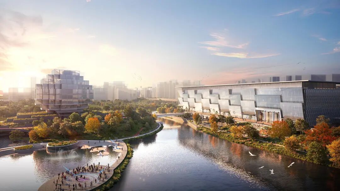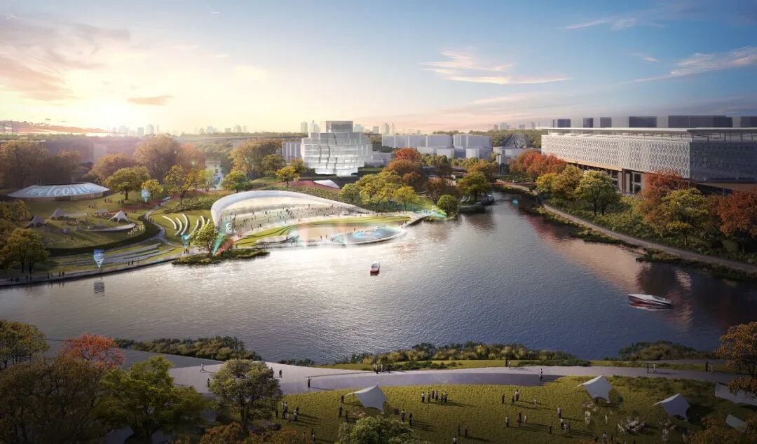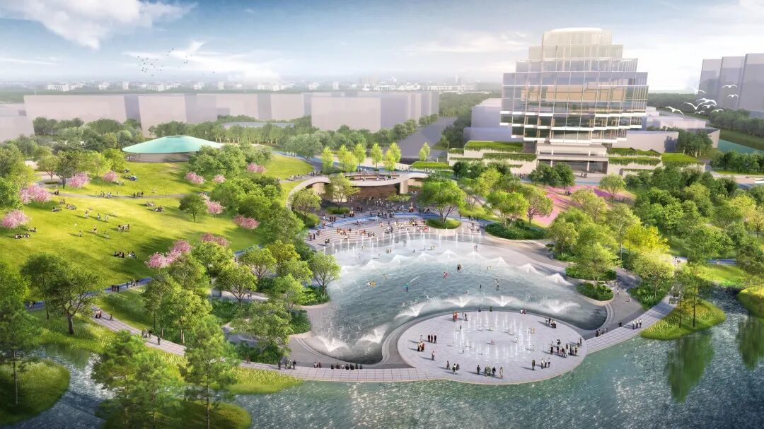 公园以“一眼自然”为设计理念,围绕“数实家园、无界客厅”主题,构建起“一湖三岸、双层双环”的空间结构,将自然景观、城市功能和公共空间织成了一张充满生活气息的网。
