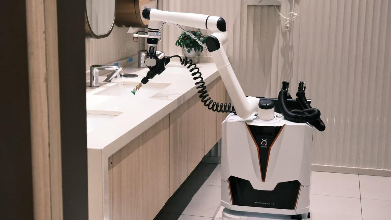 记者在算力小镇的生产车间见证了这台“清洁专家”的实战表现:机器人平稳移动至洗手盆旁,机械臂通过精准视觉识别,利用工具头对盆体边缘和底部进行细致洗刷,整个过程流畅自然。“这不是遥控操作,而是机器人完全通过视觉识别环境。”洲涌解释说,“图灵1号”能根据不同污渍自主选择工具进行高效清洁。