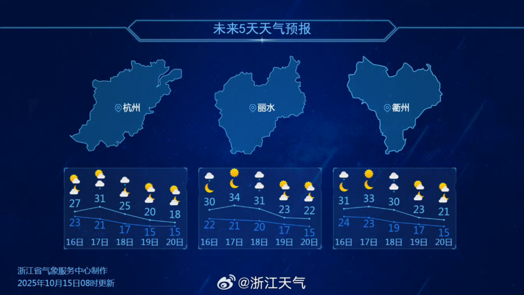 据浙江天气,杭州17日最高气温31℃,20日仅为18℃!图源:浙江天气