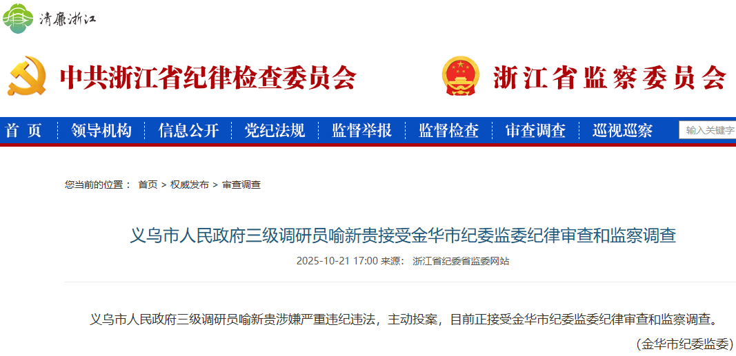 据金华市纪委监委消息: 义乌市人民政府三级调研员喻新贵 涉嫌严重违纪违法,主动投案,目前正接受金华市纪委监委纪律审查和监察调查 。