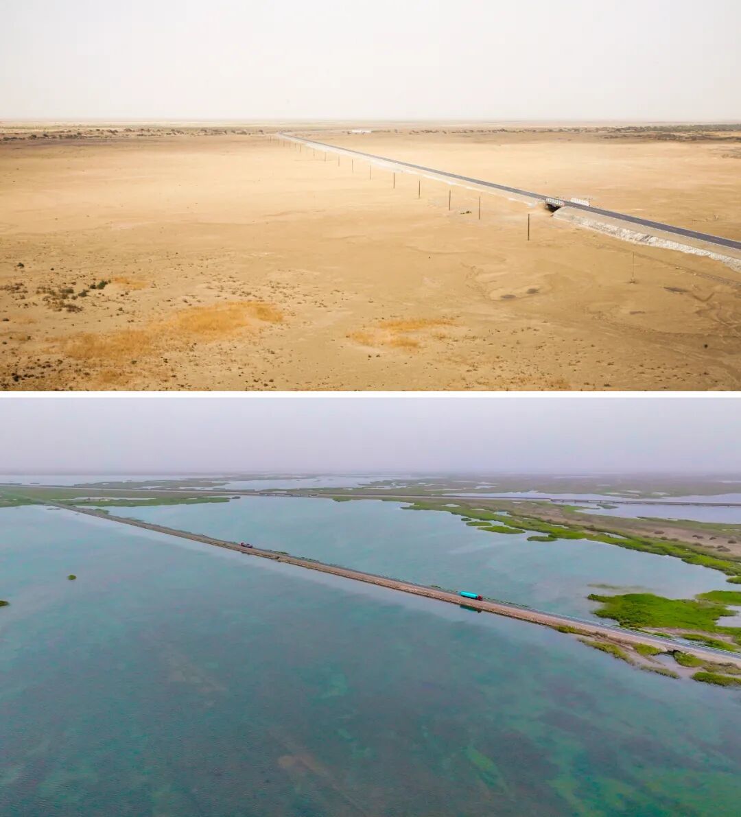 上图为2008年7月拍摄的干涸的新疆台特玛湖;下图为2025年7月拍摄的新疆台特玛湖 图源:新华社