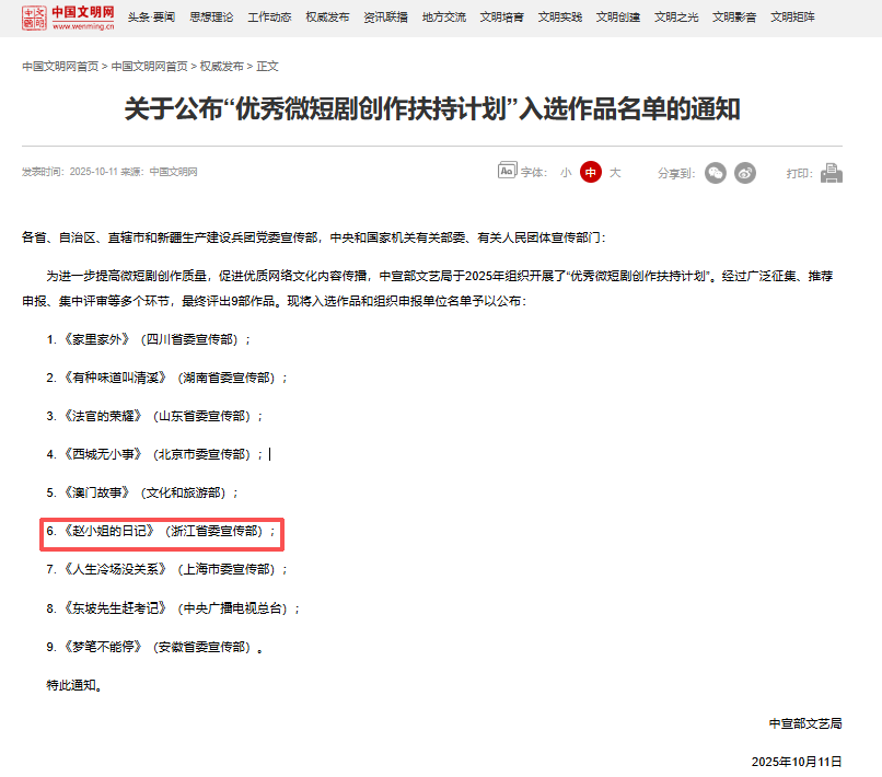 此前,围绕“微短剧+”赛道,区内企业已先后打造《赵小姐的日记》《南风知君意》《水韵风情梦塘栖》《塘栖有好戏》等8部作品,入选国家广电总局“跟着微短剧去旅行”创作计划推荐目录。特别是在不久前,《赵小姐的日记》成为全省唯一一部入选中宣部“优秀微短剧创作扶持计划”的作品,进一步展现了临平区在精品内容创作领域的“慧眼”与“格局”。