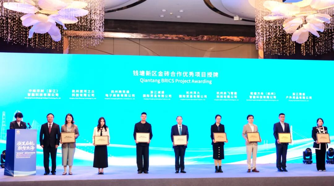自金砖国家特殊经济区中国合作中心在钱塘揭牌以来,金砖合作的种子便在这片创新沃土上不断生长,孕育出了一批具有代表性的金砖合作项目。活动现场,浙江诚通国际贸易有限公司、杭州浑大国际贸易有限公司、杭州跨竞通电子商务有限公司等8家企业凭借突出的金砖合作实践获授“钱塘(新)区金砖合作优秀项目”。