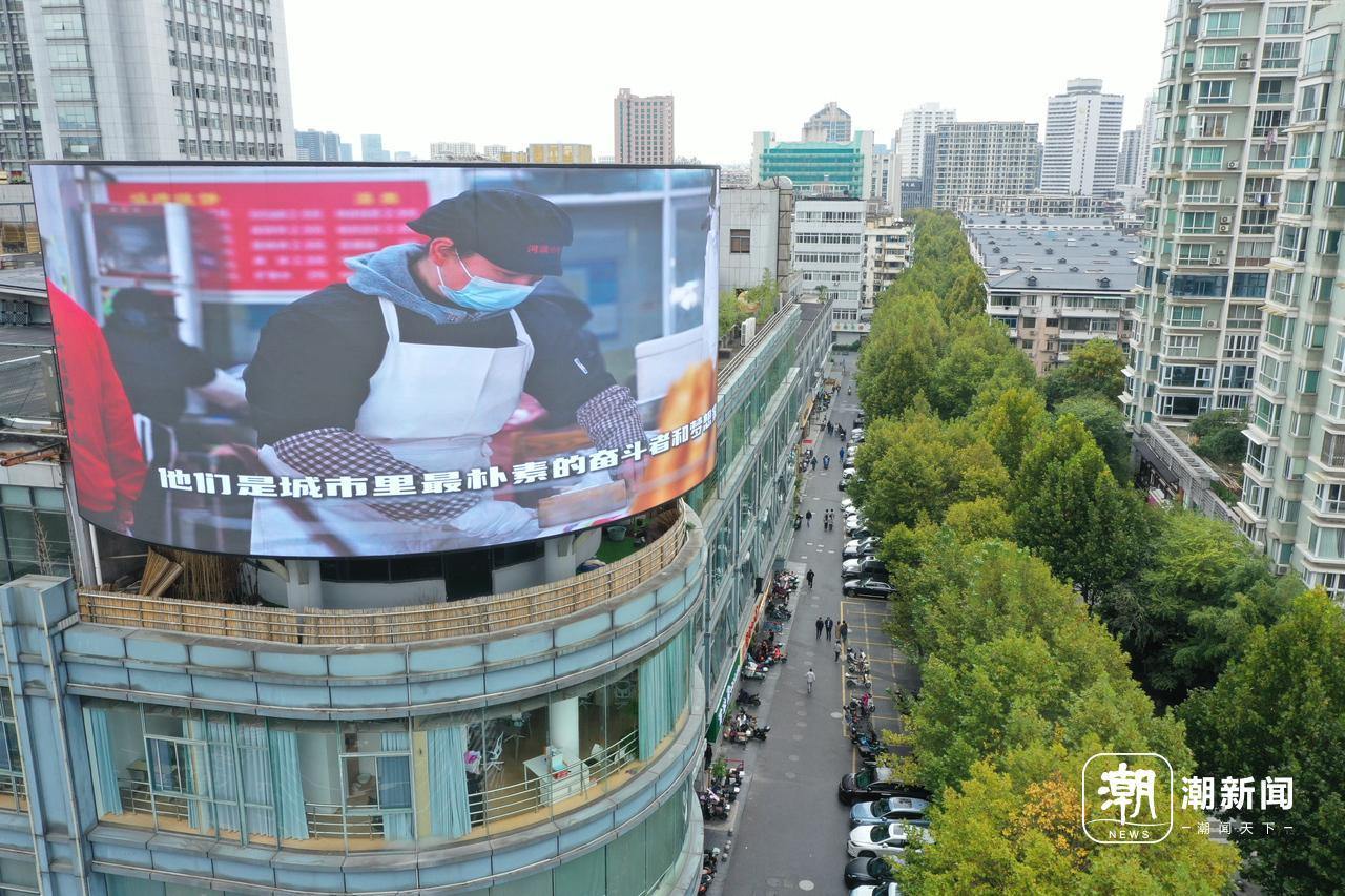 在文三路马塍路路口,小劳馄饨老板娘劳剑慧、张师傅白切羊肉店的老板娘竺玉霞、河波小吃店店主李牡丹等小店店主们亮相大屏。路过的市民、等红灯的外卖小哥不时地抬头观看。